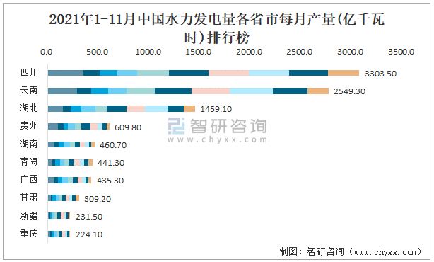 2021年1-11月中國水力發電量各省市每月產量排行榜