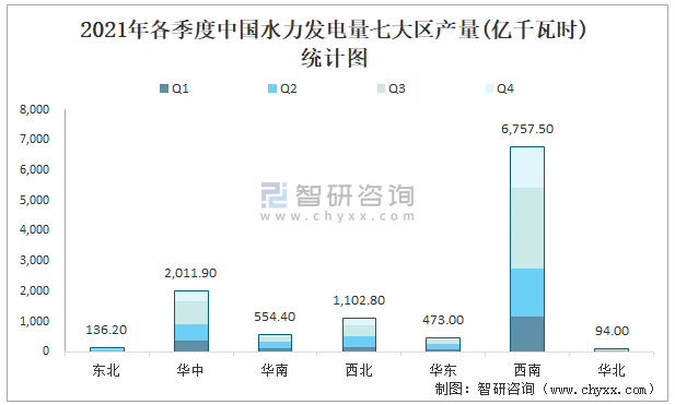 2021年各季度中國水力發電量七大區產量統計圖
