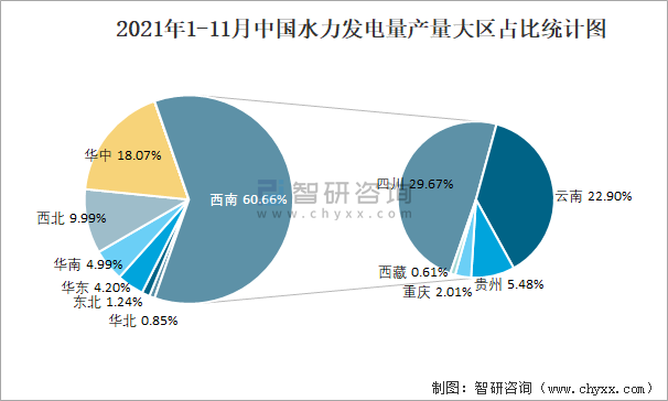 2021年1-11月中國水力發電量產量大區占比統計圖