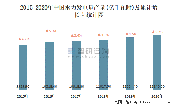 2015-2020年中國水力發電量產量及累計增長率統計圖