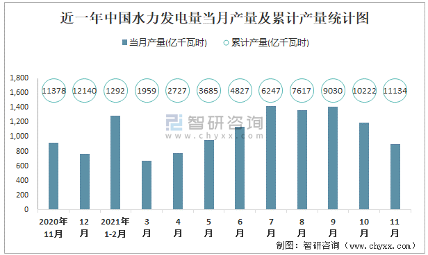 近一年中國水力發電量當月產量及累計產量統計圖