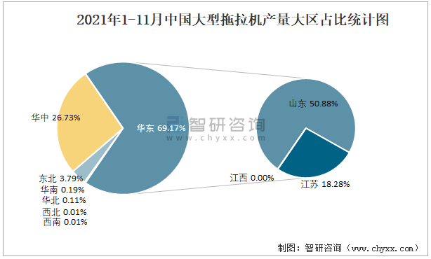 2021年1-11月中國大型拖拉機產量大區占比統計圖