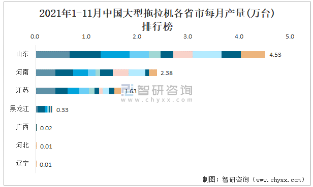 2021年1-11月中國大型拖拉機各省市每月產量排行榜