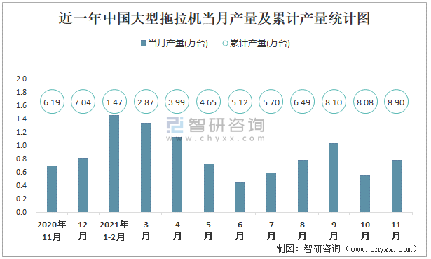 根據國家統計局數據顯示:2021年11月中國大型拖拉機產量為0.8萬臺,同比下降14.6%;2021年1-11月中國大型拖拉機累計產量為8.9萬臺,累計增長21.6%;2015-2020年中國大型拖拉機產量2019年跌至最低,次年有所上升。