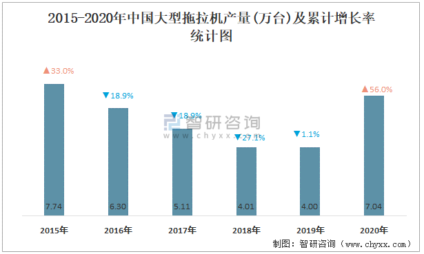 2015-2020年中國大型拖拉機產量及累計增長率統計圖