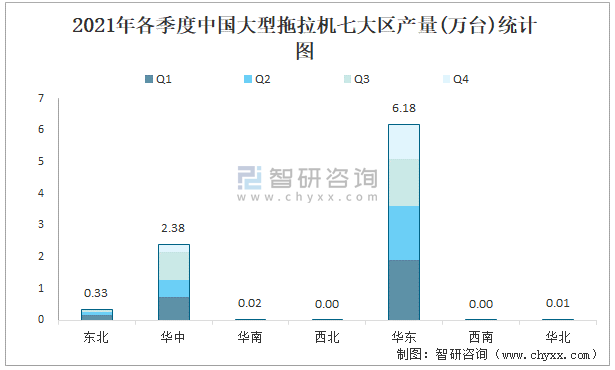 2021年各季度中國大型拖拉機七大區產量統計圖