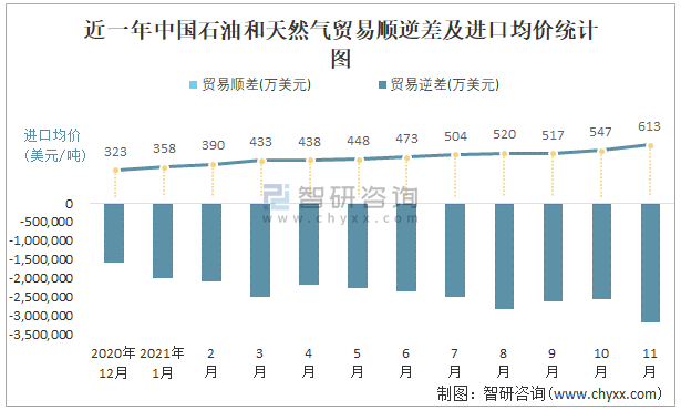 近一年中國石油和天然氣順逆差及進口均價統計圖