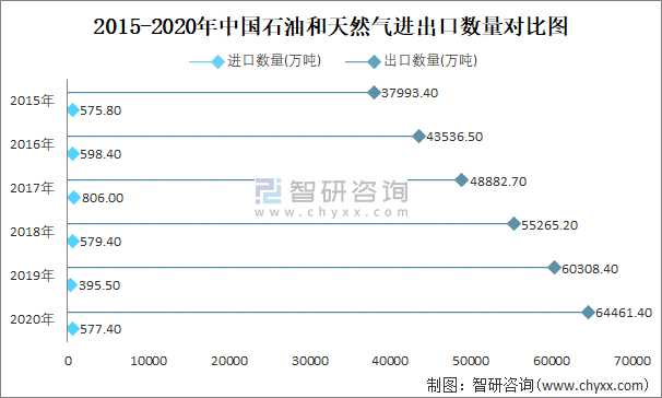 2015-2020年中國石油和天然氣進出口數量對比統計圖