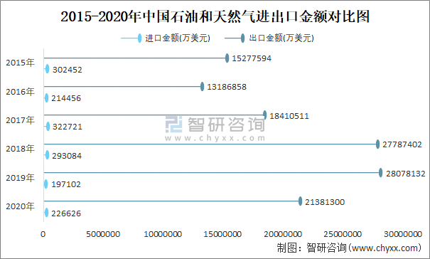 2015-2020年中國石油和天然氣進出口金額對比統計圖