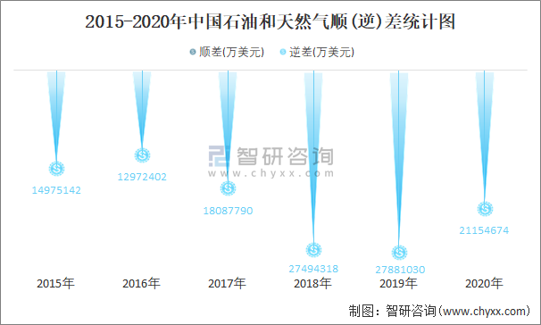 2015-2020年中國石油和天然氣順(逆)差統計圖