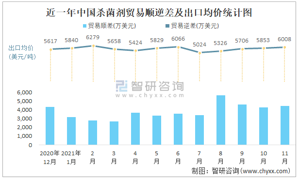 近一年中國殺菌劑順逆差及出口均價統計圖