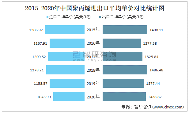 2015-2020年中國聚丙烯進出口平均單價對比統(tǒng)計圖