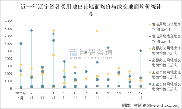 近一年遼寧省各類用地出讓地面均價與成交地面均價統計圖