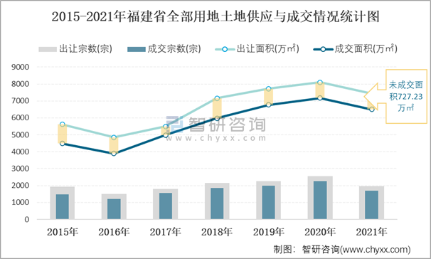 2015-2021年福建省全部用地土地供應(yīng)與成交情況統(tǒng)計圖