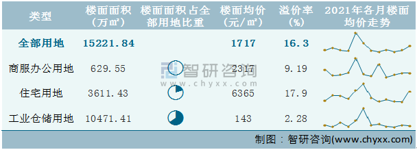 根據(jù)國信房地產(chǎn)信息網(wǎng)數(shù)據(jù)統(tǒng)計可知:2021年12月福建省全部用地出讓地面均價為5585元/㎡,其中住宅用地出讓地面均價最高(17359元/㎡),全部用地成交地面均價為5000元/㎡,其中住宅用地成交地面均價為18873元/㎡,高于商服辦公用地成交地面均價;2021年1-12月福建省工業(yè)倉儲用地樓面面積占其全部用地比重最多,為68.79%,溢價率為2.28%。