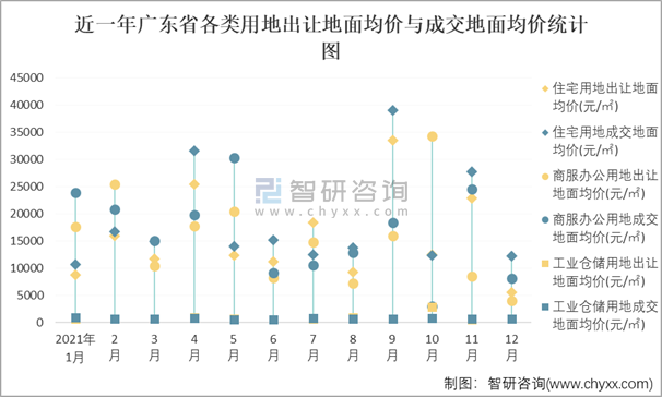 近一年廣東省各類用地出讓地面均價與成交地面均價統計圖