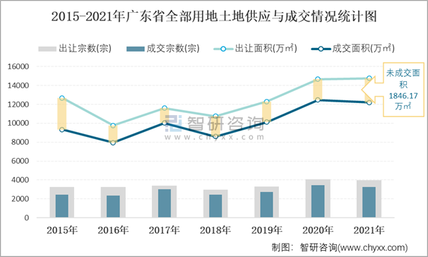 2015-2021年廣東省全部用地土地供應與成交情況統計圖