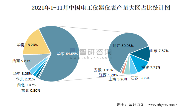 2021年1-11月中國電工儀器儀表產量為24818.3萬臺 華東地區產量最高(占比64.7%)
