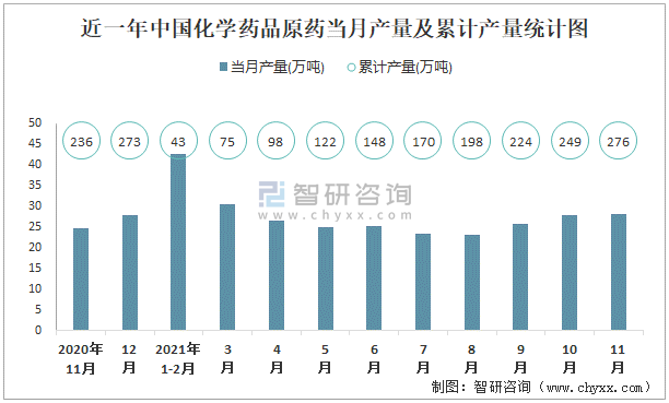 根據國家統計局數據顯示:2021年11月中國化學藥品原藥產量為28.1萬噸,同比增長6.8%;2021年1-11月中國化學藥品原藥累計產量為275.7萬噸,累計增長8.7%;2015-2020年中國化學藥品原藥產量2019年跌至最低,次年有所回升。