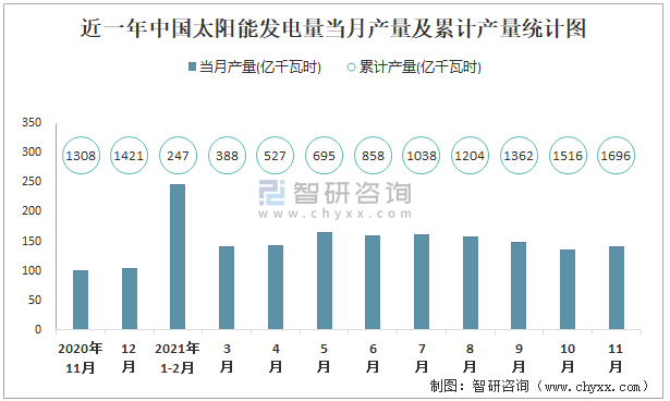 近一年中國太陽能發電量當月產量及累計產量統計圖