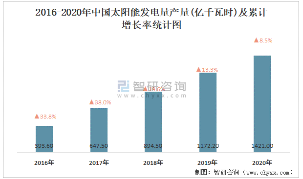2016-2020年中國太陽能發電量產量及累計增長率統計圖