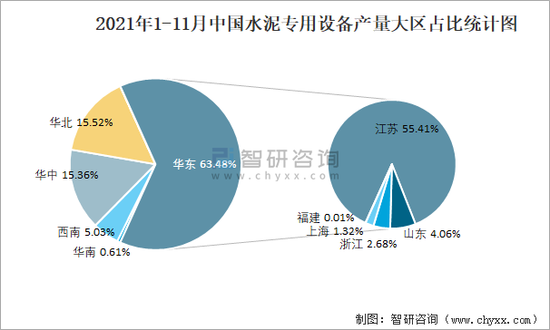 2021年1-11月中國水泥專用設備產量大區占比統計圖