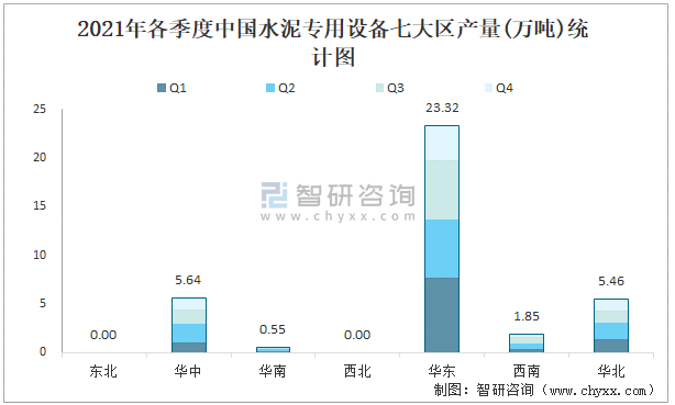 2021年各季度中國水泥專用設備七大區產量統計圖