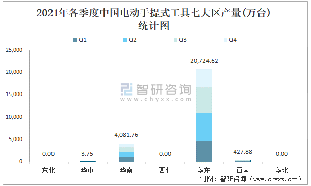 2021年各季度中國電動手提式工具七大區產量統計圖