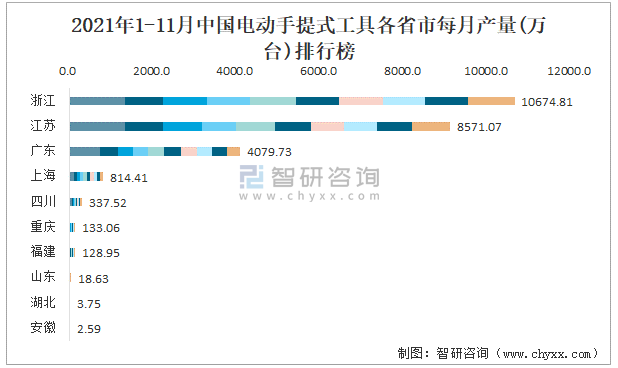2021年1-11月中國電動手提式工具各省市每月產量排行榜