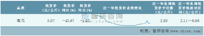 根據農村農業部數據統計可知:2022年第3周全國南瓜平均批發價為3.07元/公斤,同比下跌43.67%,環比下跌1.92%,近一年全國南瓜平均批發價最高達到6.06元/公斤,批發價最低也要2.11元/公斤。