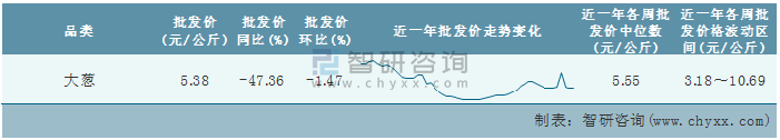 根據(jù)農村農業(yè)部數(shù)據(jù)統(tǒng)計可知:2022年第3周全國大蔥平均批發(fā)價為5.38元/公斤,同比下跌47.36%,環(huán)比下跌1.47%,近一年全國大蔥平均批發(fā)價最高達到10.69元/公斤,批發(fā)價最低也要3.18元/公斤。