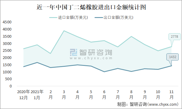 近一年中國(guó)丁二烯橡膠進(jìn)出口金額統(tǒng)計(jì)圖