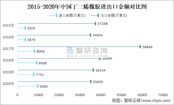 2015-2020年中國(guó)丁二烯橡膠進(jìn)出口金額對(duì)比統(tǒng)計(jì)圖