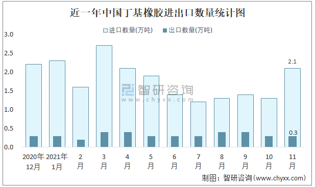 2021年11月中國丁基橡膠進出口數量分別為2.1萬噸和0.3萬噸