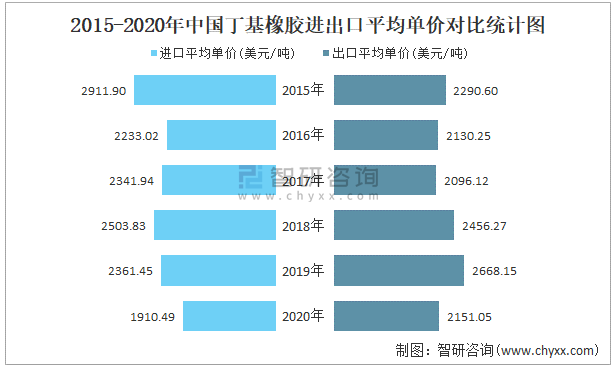 2015-2020年中國丁基橡膠進出口平均單價對比統計圖