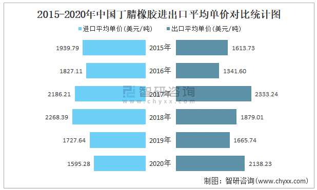 2015-2020年中國丁腈橡膠進(jìn)出口平均單價(jià)對比統(tǒng)計(jì)圖