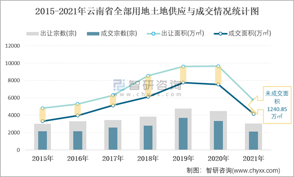 2015-2021年云南省全部用地土地供應(yīng)與成交情況統(tǒng)計(jì)圖
