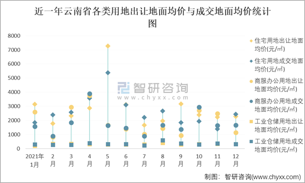 近一年云南省各類用地出讓地面均價(jià)與成交地面均價(jià)統(tǒng)計(jì)圖