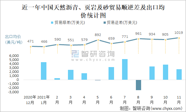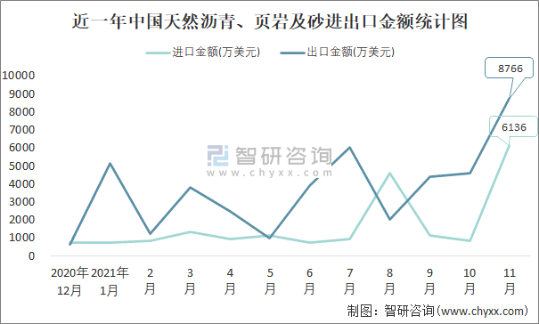 根據中國石油和化學工業聯合會數據顯示:2021年11月中國天然瀝青、頁巖及砂進口數量為12.1萬噸,出口數量為8.6萬噸;進口金額為6136萬美元,出口金額為8766萬美元;近一年中國天然瀝青、頁巖及砂出口總金額大于進口總金額,貿易順差為主,出口均價1019美元/噸。