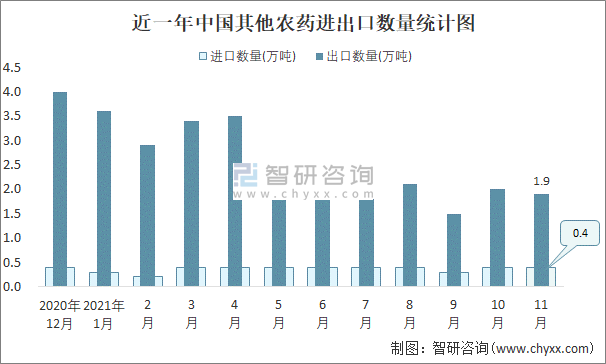 近一年中國其他農藥進出口數量統計圖