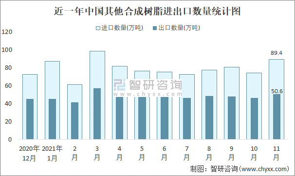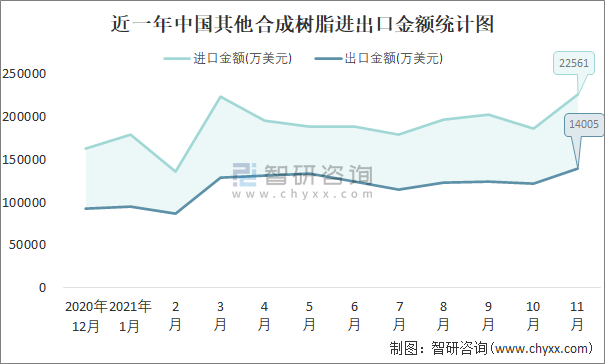 根據中國石油和化學工業聯合會數據顯示:2021年11月中國其他合成樹脂進口數量為89.4萬噸,出口數量為50.6萬噸;進口金額為225619萬美元,出口金額為140053萬美元;近一年中國其他合成樹脂出口總金額小于進口總金額,貿易逆差為主,進口均價2524美元/噸。