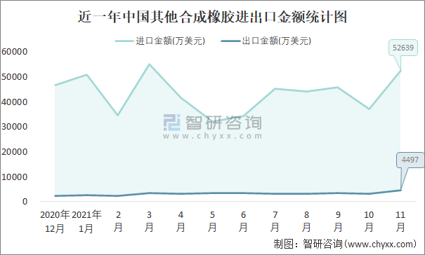 近一年中國其他合成橡膠進(jìn)出口金額統(tǒng)計(jì)圖