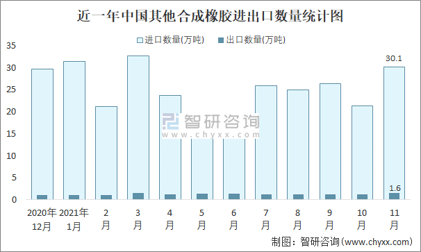 2021年11月中國其他合成橡膠進(jìn)出口數(shù)量分別為30.1萬噸和1.6萬噸
