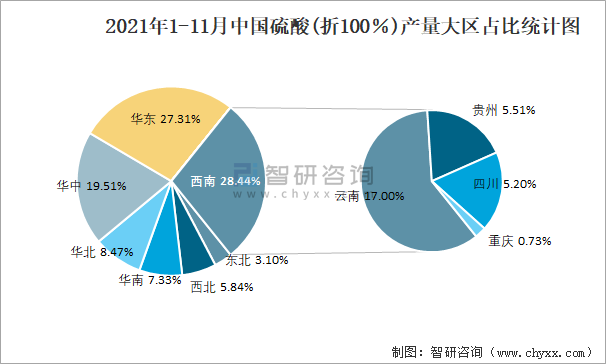 2021年1-11月中國硫酸(折100%)產量大區占比統計圖