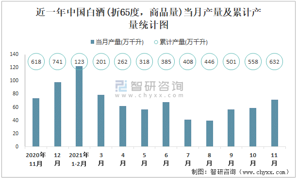 根據國家統計局數據顯示:2021年11月中國白酒(折65度,商品量)產量為71.5萬千升,同比增長0.3%;2021年1-11月中國白酒(折65度,商品量)累計產量為632.4萬千升,累計增長5.4%;2015-2020年中國白酒(折65度,商品量)產量2016年達到最高,此后逐年遞減。