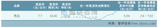 根據農村農業部數據統計可知:2022年第4周全國西瓜平均批發價為7.7元/公斤,同比增加33.45%,環比下跌1.53%,近一年全國西瓜平均批發價最高達到7.82元/公斤,批發價最低也要2.6元/公斤。
