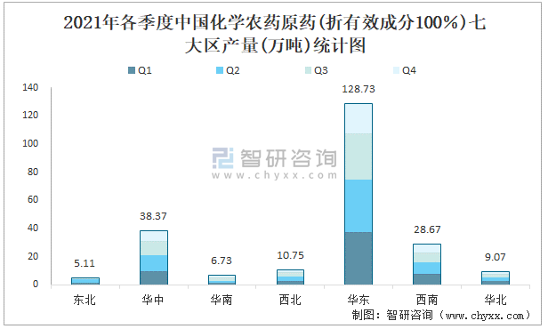 2021年各季度中國化學農藥原藥(折有效成分100%)七大區(qū)產量統(tǒng)計圖