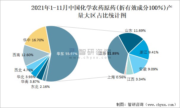 2021年1-11月中國化學農藥原藥(折有效成分100%)產量為227.5萬噸 華東地區(qū)產量最高(占比56%)