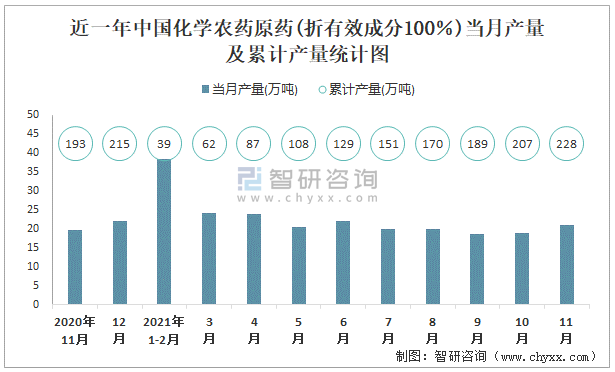 近一年中國化學農藥原藥(折有效成分100%)當月產量及累計產量統(tǒng)計圖