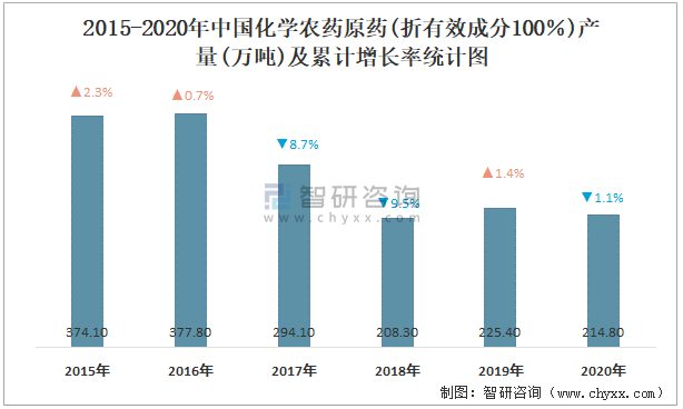 2015-2020年中國化學農藥原藥(折有效成分100%)產量及累計增長率統(tǒng)計圖